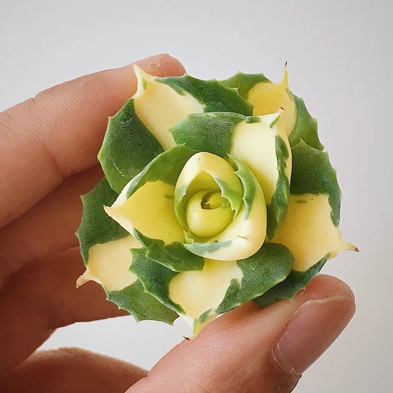 The Princess Thunderbolt Yellow Mid‑Pattern (scientific name: *Agave isthmensis* ‘Hoi Raiz’) is a small succulent in the Agavaceae family, genus *Agave*, and is a variegated form of the Thunderbolt. The plant has no stem; the leaves are short and wide, crab‑shell shaped, with fleshy teeth and reddish‑brown short spines along the margins, and a vertical yellow variegated stripe runs through the middle of the leaf surface, giving it a translucent, jade‑like texture. Because the variegated area covers more than 50 % of the leaf, it is a rare horticultural variety within its genus. This variety originated from a bud mutation of the Princess Thunderbolt White Mid‑Pattern; the original Thunderbolt species is native to the southwestern United States and northern Mexico. It grows slowly, prefers dappled light or shade, and can be scorched by strong summer light; in winter watering must be controlled to prevent root rot. It is best cultivated in a granulated mix to ensure good aeration. The variegation is caused by chlorophyll deficiency, which results in low photosynthetic efficiency, poor stability, and a tendency to revert to the white pattern or die. The lower part of the leaf tip shows a characteristic fissure, so daily care should keep the substrate slightly dry.