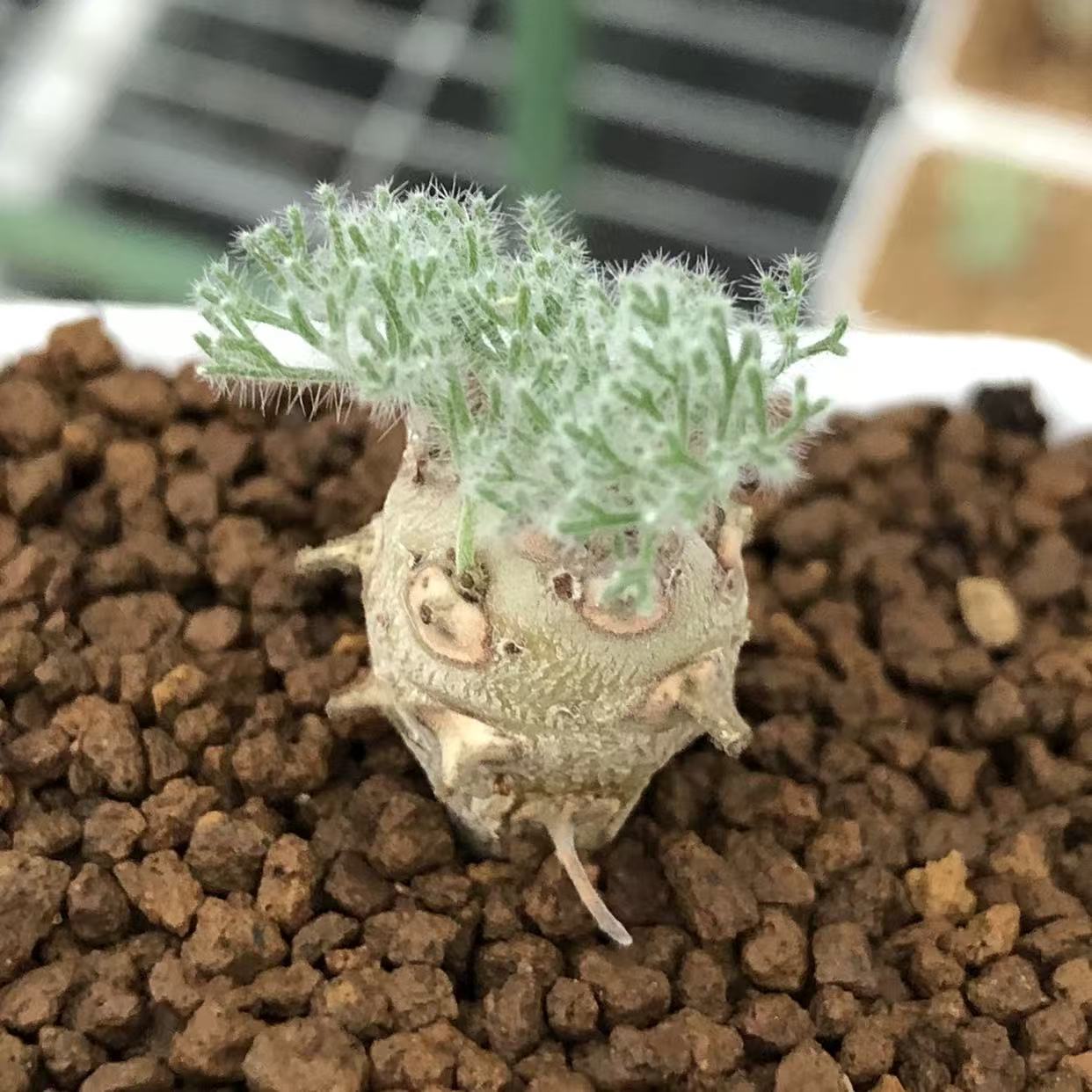 White‑skin Moon Realm (scientific name: *Monsonia peniculina*) is a perennial dwarf shrub in the Asteraceae family. It is native to southern Africa, particularly Namibia and South Africa. The fleshy stems are covered with a waxy protective layer, and the leaves are a tender greenish‑yellow lanceolate shape, densely covered with fine hairs, which provides drought tolerance and protection against windblown sand. The base of the fleshy stem swells into a blocky shape, with a grey‑white waxy coating that reduces water loss and protects against gravel abrasion. Branch tips bear clusters of green lanceolate leaves; the leaf surfaces are densely velvety, with leaves reaching 3–4 cm in length. The overall height of the plant typically does not exceed 30 cm.